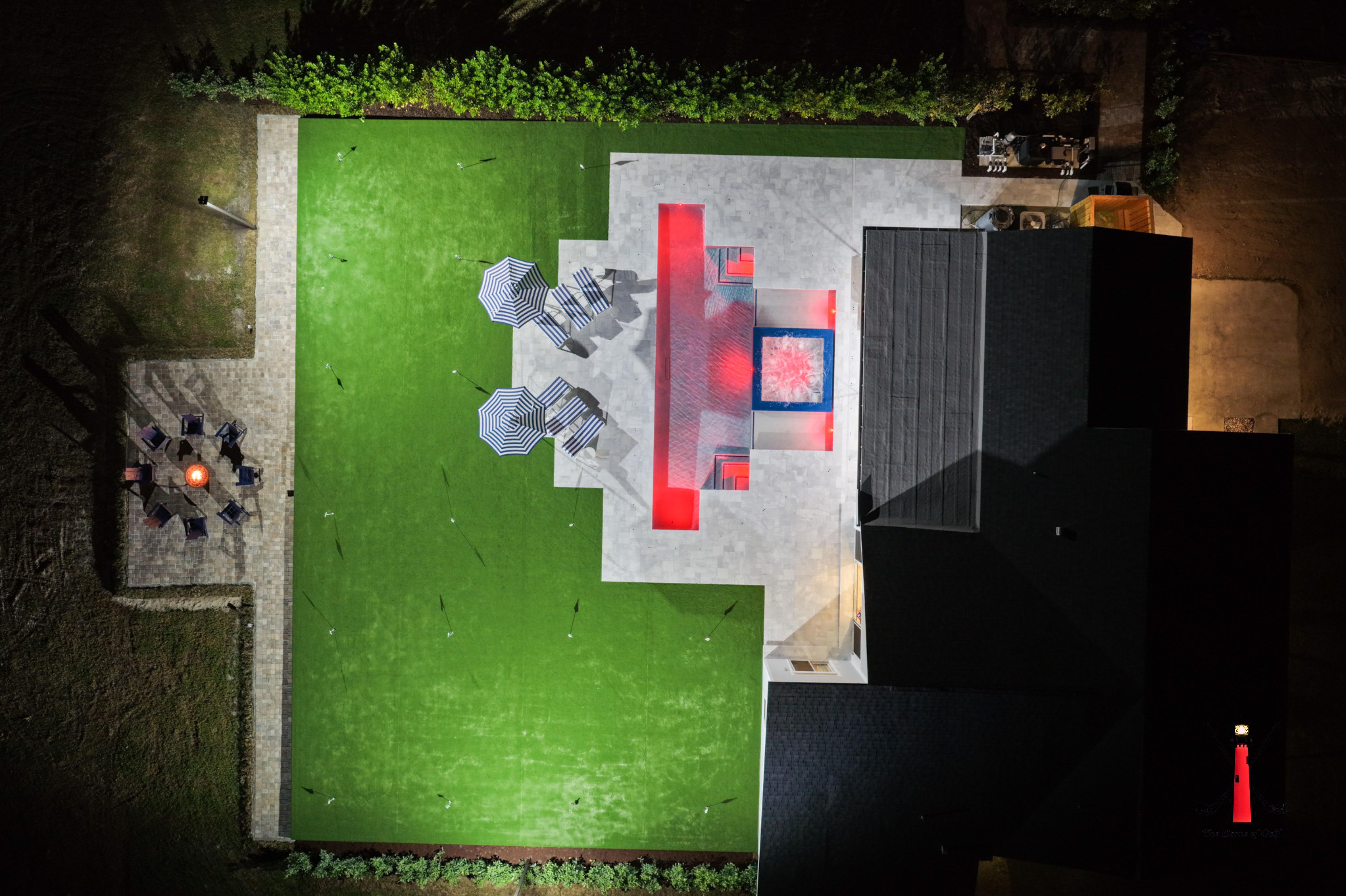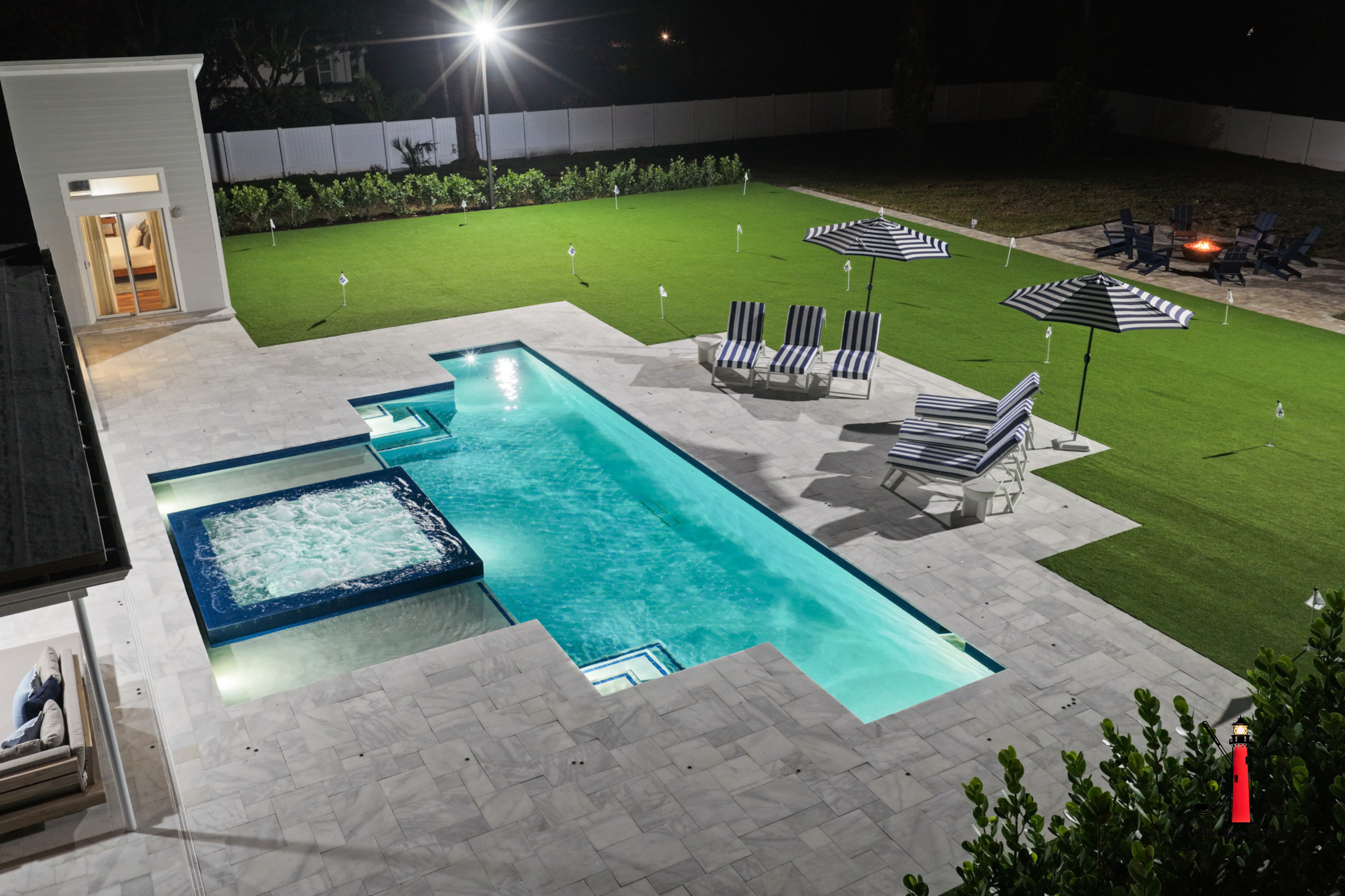 OUTDOOR: Dive into relaxation at our stunning pool, complete with comfortable chairs and a cozy table, perfectly illuminated by charming lights for evening gatherings